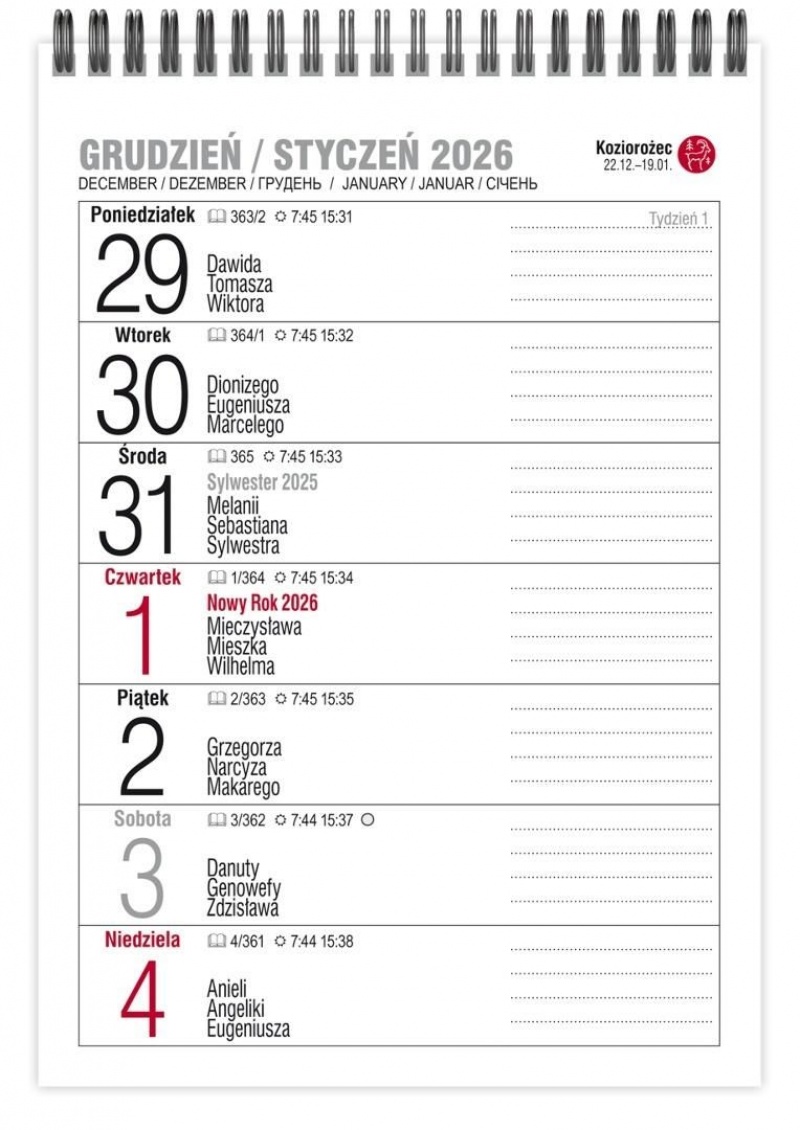 KALENDARZ BIURKOWY PIONOWY TYGODNIOWY MINI 2026