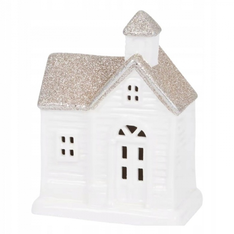 Dekoracyjny Domek - Uroczy ceramiczny domek z brokatowym daszkiem, idealny do świątecznej dekoracji wnętrz. Wspaniale prezentuje się na stole lub jako element wystroju w zimowe miesiące.