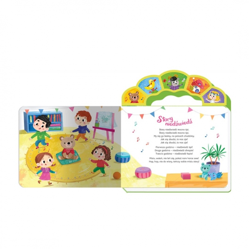 Oddajemy do Państwa rąk zbiór z pięknie zaśpiewnymi piosenkami dla dzieci, lubianymi i znanymi od pokoleń. Format książki jest bardzo poręczny dla malucha – idealnie dopasowuje się do małych rączek. Kolorowe ilustracje oraz teksty każdej z piosenek zachęcą dziecko do wspólnego śpiewania. Teksty otoczone są kolorowymi ilustracjami, nawiązującymi do treści piosenek, często je uzupełniają, a co najważniejsze – zachęcają do wspólnej zabawy. Piosenkę można włączyć, naciskając obrazek na rączce – jeden obrazek odpowiada jednej piosence. W każdej chwili można wyłączyć grającą melodię, ponownie naciskając obrazek. Książka działa na baterie, które można wyjąć i wymienić. Istnieje również możliwość wyłączenia grających piosenek, przesuwając guzik przy baterii. Książka sprawdzi się dla dzieci w każdym wieku. Młodsze mogą tylko słuchać piosenek, starsze dzieci mogą przeczytać tekst i śpiewać równocześnie z nagraniem.