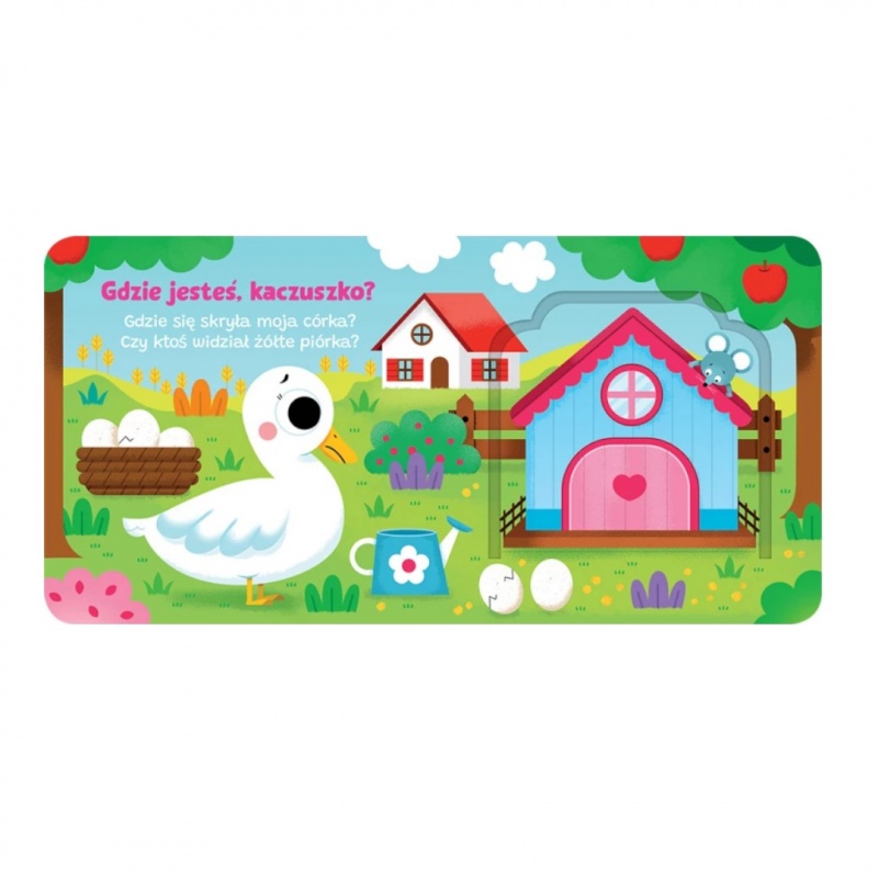 Aktywizująca książeczka dla najmłodszych. Zabawa tą książką polega na otwieraniu okienek, w których kryją się zwierzęta z wiejskiej zagrody: kury, świnka, krowa, kotek i mała kaczuszka, której na wsi szuka mama kaczka. Na każdej rozkładówce znajduje się wierszyk o szukaniu kaczuszki przez zmartwioną mamę – wierszowany tekst łatwo zapada w pamięć i po kilku godzinach zabawy dziecko będzie znało wierszyki, dzięki czemu ćwiczy pamięć i wzbogaca swoje słownictwo. Książeczka z okienkami to doskonała zabawa dla każdego dziecka.