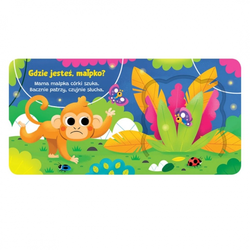 Aktywizująca książeczka dla najmłodszych. Zabawa tą książką polega na otwieraniu okienek, w których kryją się egzotyczne zwierzęta: papuga, tygrys, krokodyl, wąż i mała małpka, której w dżungli szuka mama małpka. Na każdej rozkładówce znajduje się krótki wierszyk o szukaniu małpki przez zmartwioną mamę – wierszowany tekst łatwo zapada w pamięć i po kilku godzinach zabawy dziecko będzie znało wierszyki, dzięki czemu ćwiczy pamięć i wzbogaca swoje słownictwo. Książeczka z okienkami to doskonała zabawa dla każdego dziecka.