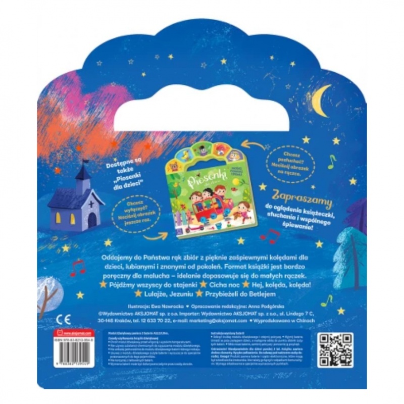 Oddajemy do Państwa rąk zbiór z pięknie zaśpiewnymi kolędami dla dzieci, lubianymi i znanymi od pokoleń. Format książki jest bardzo poręczny dla malucha – idealnie dopasowuje się do małych rączek. Kolorowe ilustracje oraz teksty każdej z kolęd zachęcą dziecko do wspólnego śpiewania. Teksty otoczone są kolorowymi ilustracjami, nawiązującymi do treści piosenek, często je uzupełniają, a co najważniejsze – zachęcają do wspólnego kolędowania. Nagranie można włączyć, naciskając obrazek na rączce – jeden obrazek odpowiada jednej kolędzie. W każdej chwili można wyłączyć grającą melodię, ponownie naciskając obrazek. Książka działa na baterie, które można wyjąć i wymienić. Istnieje również możliwość wyłączenia grających piosenek, przesuwając guzik przy baterii. Książka sprawdzi się dla dzieci w każdym wieku. Młodsze mogą tylko słuchać piosenek, starsze dzieci mogą przeczytać tekst i śpiewać równocześnie z nagraniem.