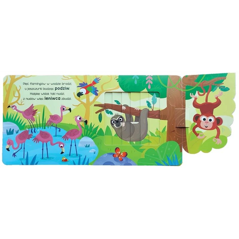 Mali czytelnicy poznają perypetie mieszkańców dżungli przedstawione w dynamicznych scenkach. Słoń zrobi użytek z trąby i nie straszny będzie mu upał. Leniwiec nie wypocznie w sąsiedztwie żabki. Paw zaprezentuje swoją największą dumę. Mamie tygrysicy nie dane będzie spokojnie zmrużyć oka. Zatarg legwana z krokodylem poruszy nawet spokojną kapibarę.