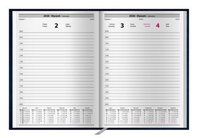 Układ kalendarium dzienny. 336 stron. Wymiary 143x211 mm