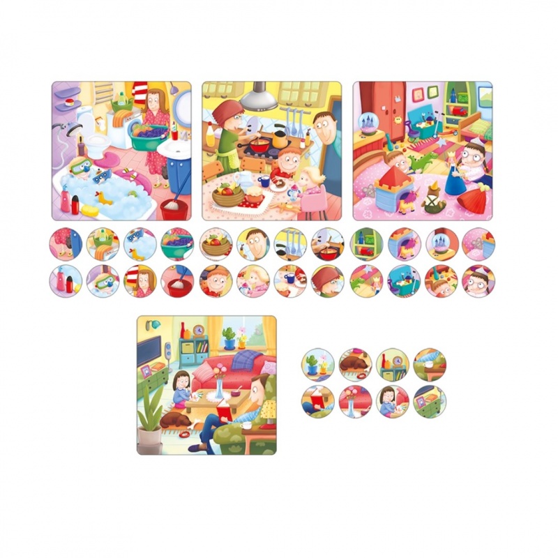 Zestaw edukacyjny Szukaj w domu składa się z 4 plansz, a także 32 plakietek z przedmiotami, które możesz znaleźć w poszczególnych pomieszczeniach w swoim domu. Dzieci po kolei analizując swój rysunek, dobierają elementy pasujące do swojej planszy. Zestaw edukacyjny Szukaj w domu uczy myślenia, rozwija zdolność kojarzenia, identyfikowania poszczególnych przedmiotów i ich przeznaczenia.