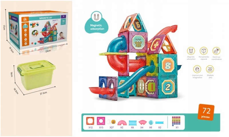 Zestaw składa się z 72 kolorowych elementów, które łączą się ze sobą dzięki magnesom wbudowanym w krawędzie każdego klocka.