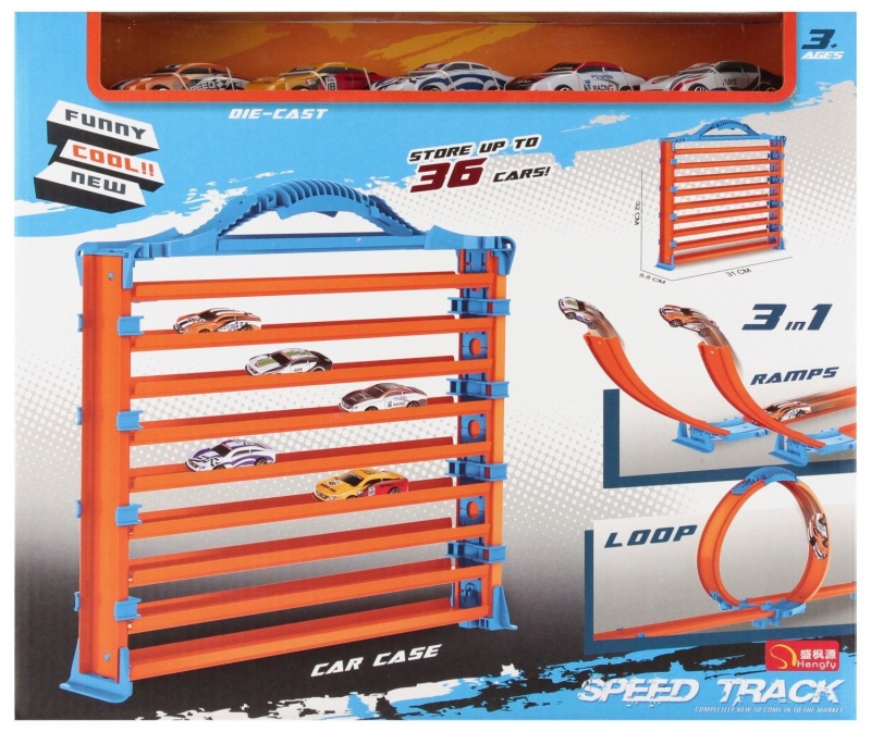 Zawartość zestawu: tor/garaż do samodzielnego montażu, 5x samochody.