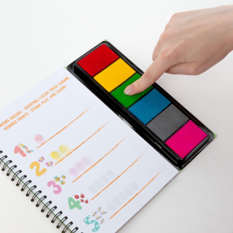 Książeczka kreatywne zoo do malowania paluszkami. Wybierz wzór z książki, który chcesz wypełnić – możesz skorzystać ze stron edukacyjnych, ucząc się liczyć, stworzyć bardzo łatwo zwierzaka przy pomocy odcisków palców albo pokolorować jeden z obrazków znajdujących się w środku. Dotknij gąbeczki z wybranym kolorem kilkukrotnie, możesz także przyłożyć palec do kilku gąbeczek, aby zmieszać ze sobą barwy i utworzyć nowe kolory. Przyciśnij paluszki w odpowiednich miejscach na arkuszu. Baw się eksperymentując z kolorami i różnymi odciskami. A może chcesz zabawić się w detektywa? Ta wyjątkowa książeczka zawiera gąbeczki z kolorowymi tuszami, 21 kolorowanek oraz 8 kart edukacyjnych.