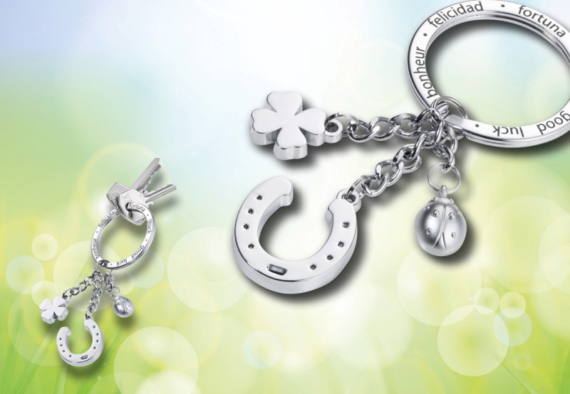 • trzy symbole szczęścia w jednym – podkowa, biedronka i czterolistna koniczyna połączone na breloku to gwarancja pomyślności