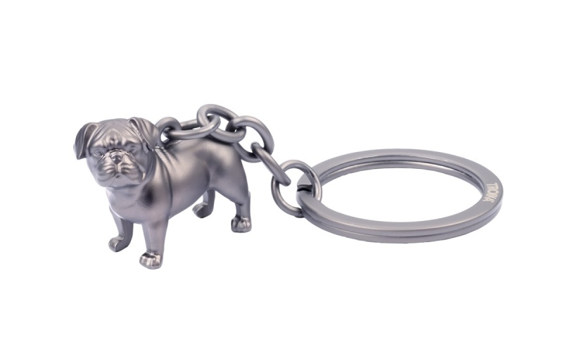 • 3D brelok w kształcie mopsa – matowe, szare wykończenie z odlewu metalu