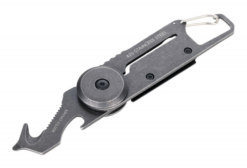 • posiada 5 funkcji: nóż do otwierania paczek, karabińczyk, mały brzeszczot, śrubokręt płaski, otwieracz do butelek