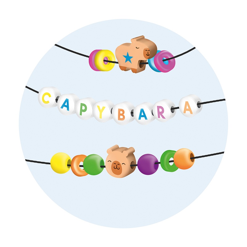 • zestaw zawiera ponad 200 elementów: kolorowe koraliki (dyski Ø ok. 6 mm, dyski z literami Ø ok. 6 mm, kulki Ø ok. 5 mm) oraz urocze koraliki w kształcie kapibar i ich pyszczków w neonowych kolorach