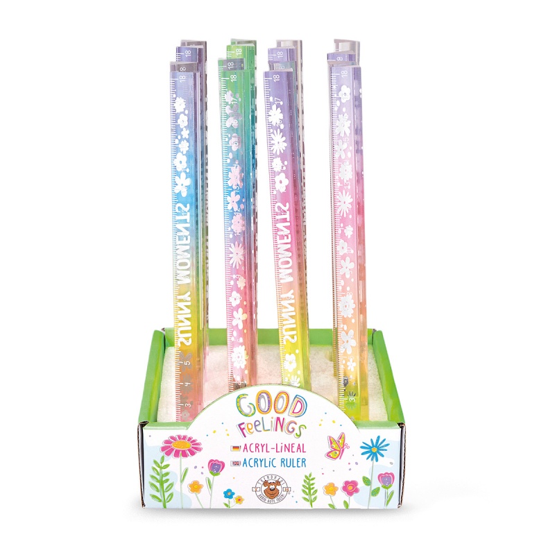 • akrylowa linijka z przezroczystym tęczowym gradientem kolorów i eleganckim srebrnym nadrukiem doskonale leży w dłoni i przyciąga wzrok na każdym biurku