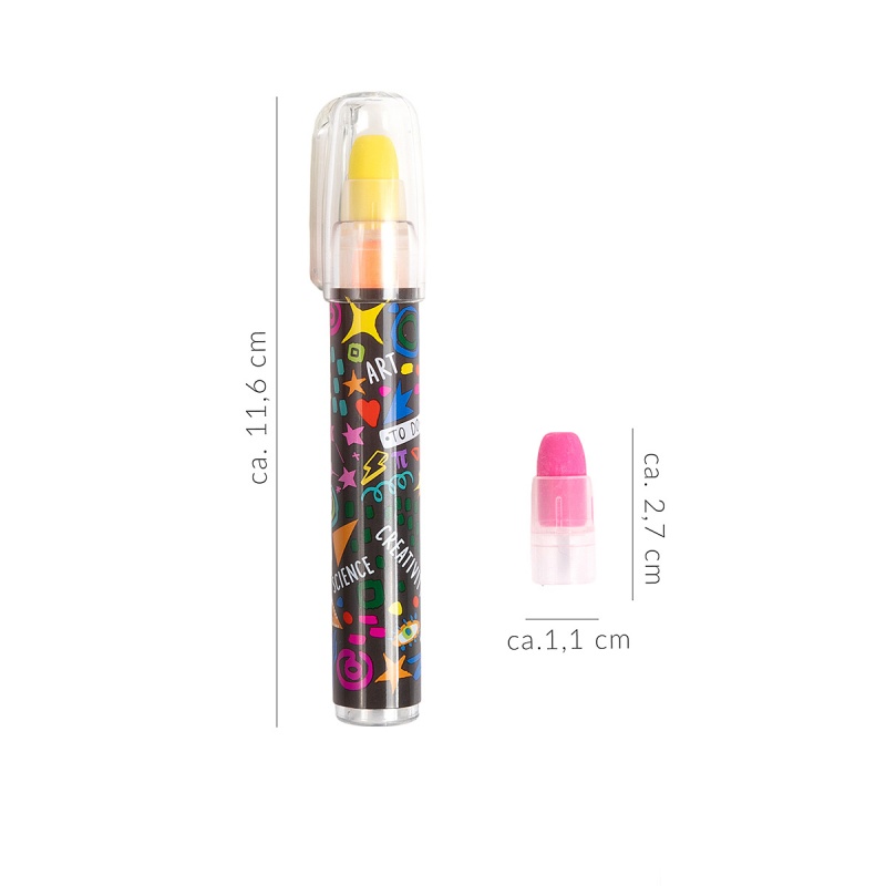 • każdy ołówek-gumka zawiera 5 wymiennych końcówek w kolorach różowym, niebieskim, żółtym, zielonym i pomarańczowym