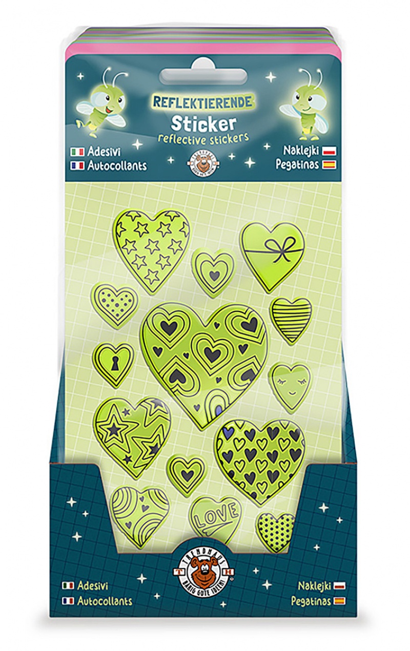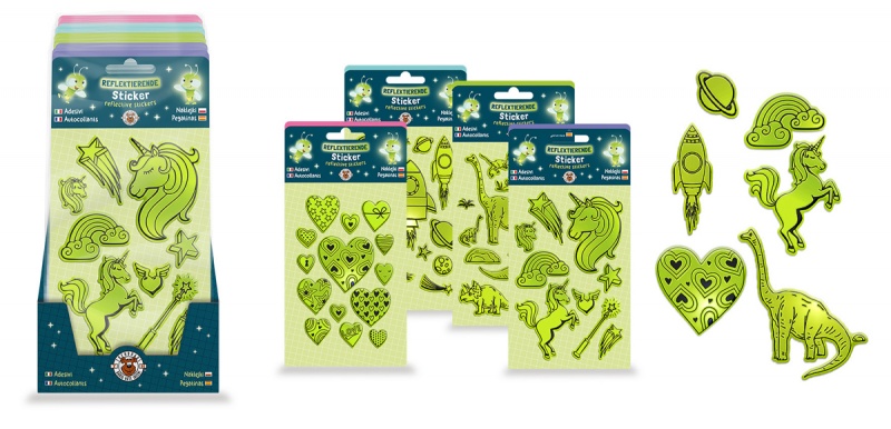 • zestaw zawiera od 9 do 15 odblaskowych naklejek w różnych rozmiarach dopasowanych do wspólnej tematyki