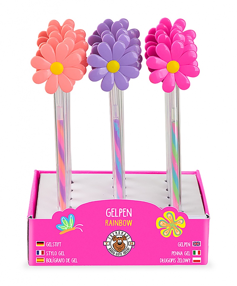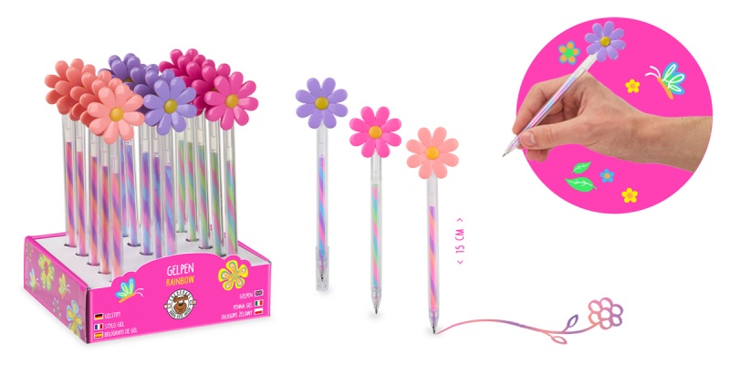 • kolorowy, radosny i kreatywny długopis żelowy w kształcie kwiatka łączy trzy jasne kolory w jednym wkładzie