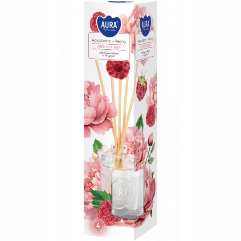 • Dyfuzor zapachowy z patyczkami, malina - piwonia o pojemności 45ml i trwałości zapachu do 4 tygodni BISPOL.