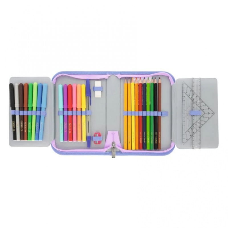 12 kredek, 12 flamastrów, 1 długopis, 1 ołówek, 1 gumka do ścierania, 1 temperówka, 1 linijka 15 cm, 1 linijka szablonowa 15 cm, 1 trójkątna linijka