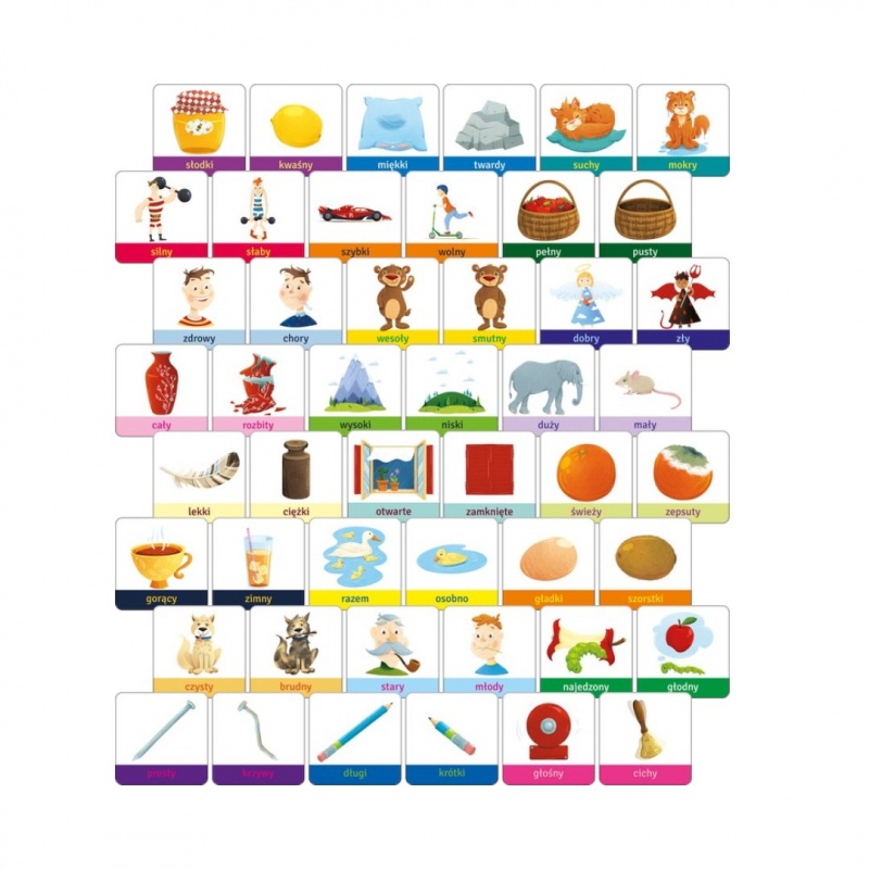 Zadaniem uczestników zabawy jest odnalezienie, a później nazwanie 24 przeciwieństw. W środku pudełka znajduje się instrukcja z opisem trzech gier, w które można grać zarówno w gronie rodzinnym jak i przedszkolu. Zestaw, w większych grupach, może także służyć jako układanka, na podstawie której nauczyciel scharakteryzuje i utrwali cechy przeciwne.