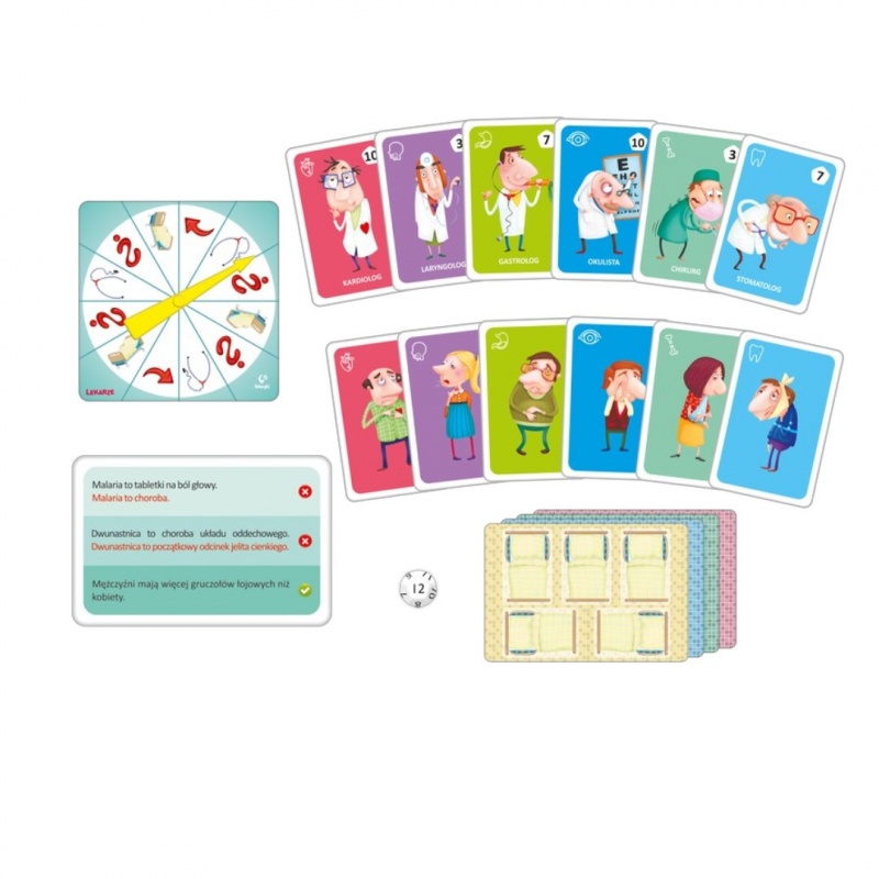 Lekarze to gra edukacyjna, która zapewni rozrywkę i pożyteczną wiedzę z zakresu biologii i ludzkiego ciała tym młodszym, jak i starszym graczom! Rozwiązuj zadania, wykaż się wiedzą i wylecz jak największą ilość pacjentów w swoim szpitalu. Dodatkowym plusem będzie umiejętność zarządzania i strategicznego myślenia godnego dyrektora szpitala. W pudełku znajdziesz karty z pytaniami o różnym poziomie trudności, karty lekarzy różnych specjalizacji oraz karty pacjentów. Chwytaj planszę, zakręć kołem i...na zdrowie!