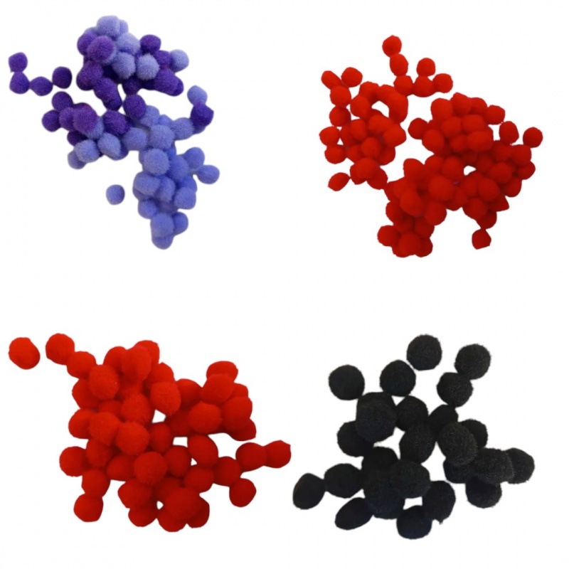 W zestawie znajdują się pompony o średnicy 10 mm w odcieniach fioletu i czerwieni oraz 13 mm w kolorach czerwonym i czarnym.