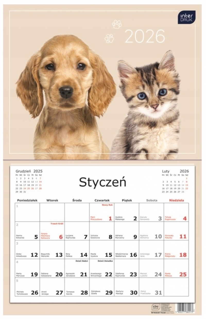 Kalendarz jednodzielny 32x50cm Zwierzaki 2026, Ścienne, Kalendarze