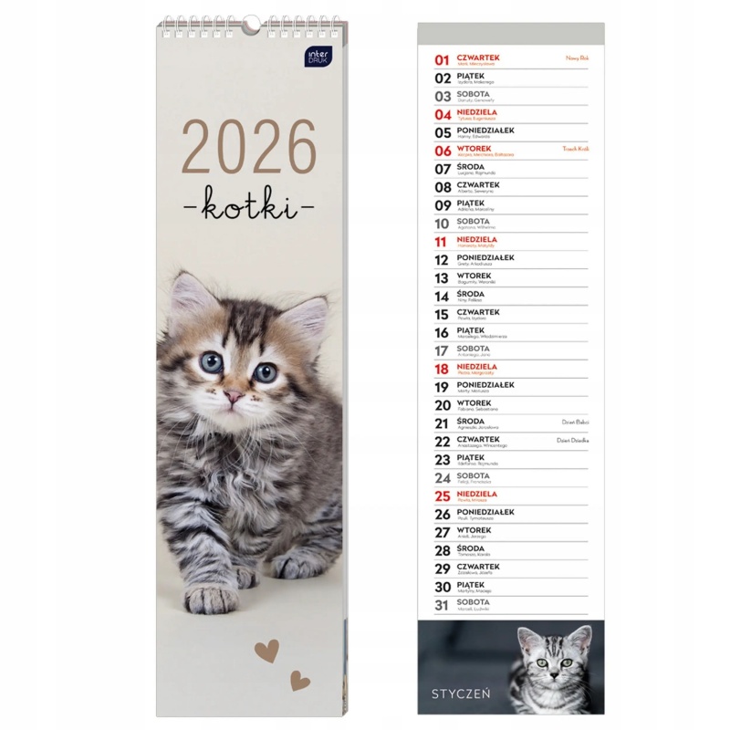 Kalendarz paskowy 13,5x50cm Koty 2026, Ścienne, Kalendarze