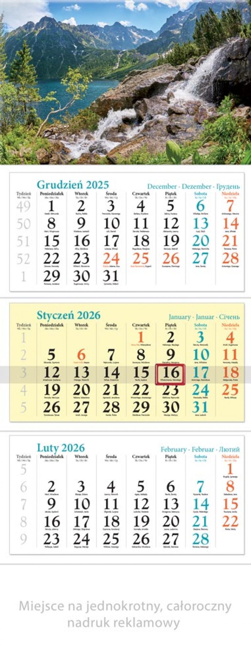 KALENDARZ TRÓJDZIELNY KT01 TATRY 2026 Specyfikacja kalendarzy trójdzielnych KT format kalendarza z "główką" i polem pod nadruk reklamowy 32...