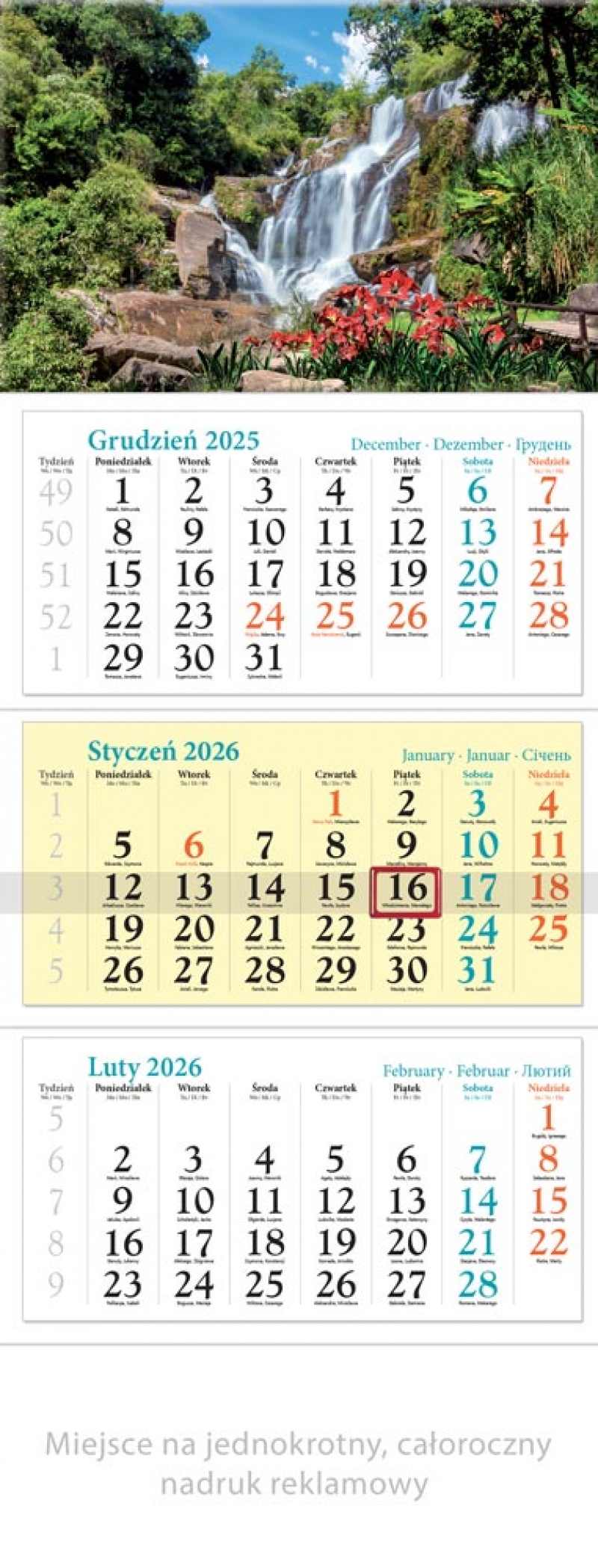 KALENDARZ TRÓJDZIELNY KT09 KASKADA 2026 Specyfikacja kalendarzy trójdzielnych KT format kalendarza z "główką" i polem pod nadruk reklamowy...
