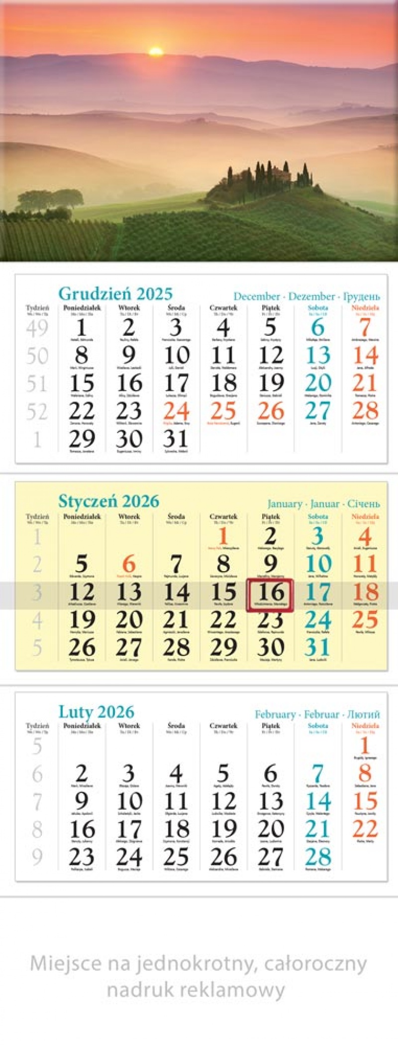 KALENDARZ TRÓJDZIELNY KT11 TOSKANIA 2026 Specyfikacja kalendarzy trójdzielnych KT format kalendarza z "główką" i polem pod nadruk reklamowy...