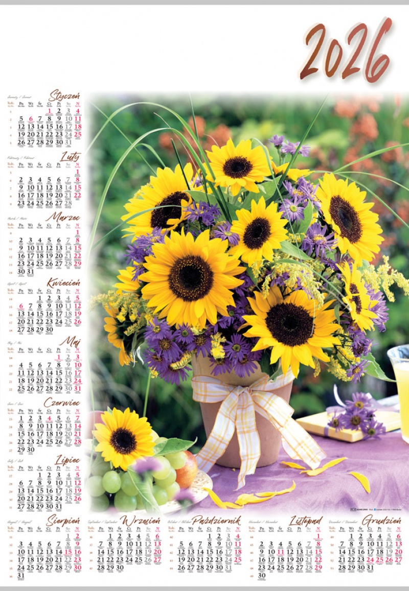 KALENDARZ JEDNOPLANSZOWY A1 PL13 SŁONECZNIKI 2026 Specyfikacja kalendarzy plakatowych PL-A1 format kalendarza 60,7 x 88 cm; kalendarze...