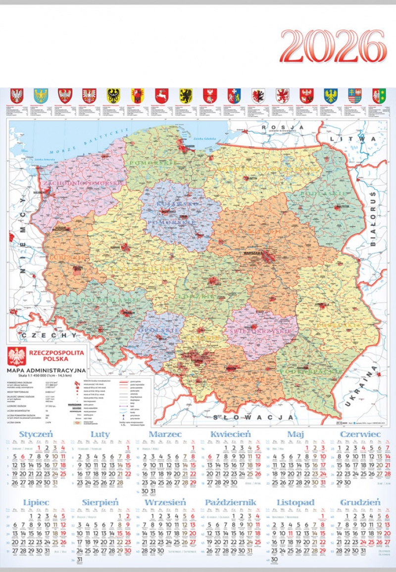KALENDARZ JEDNOPLANSZOWY A1 PL15 MAPA 2026 Specyfikacja kalendarzy plakatowych PL-A1 format kalendarza 60,7 x 88 cm; kalendarze ścienne,...