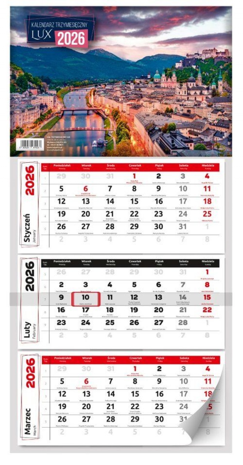 KALENDARZ TRÓJDZIELNY LUX 2026 Kalendarz ścienny, trzymiesięczny z okienkiem 12 kart. 2 wzory główek. Wymiary po rozłożeniu 295x650 mm....