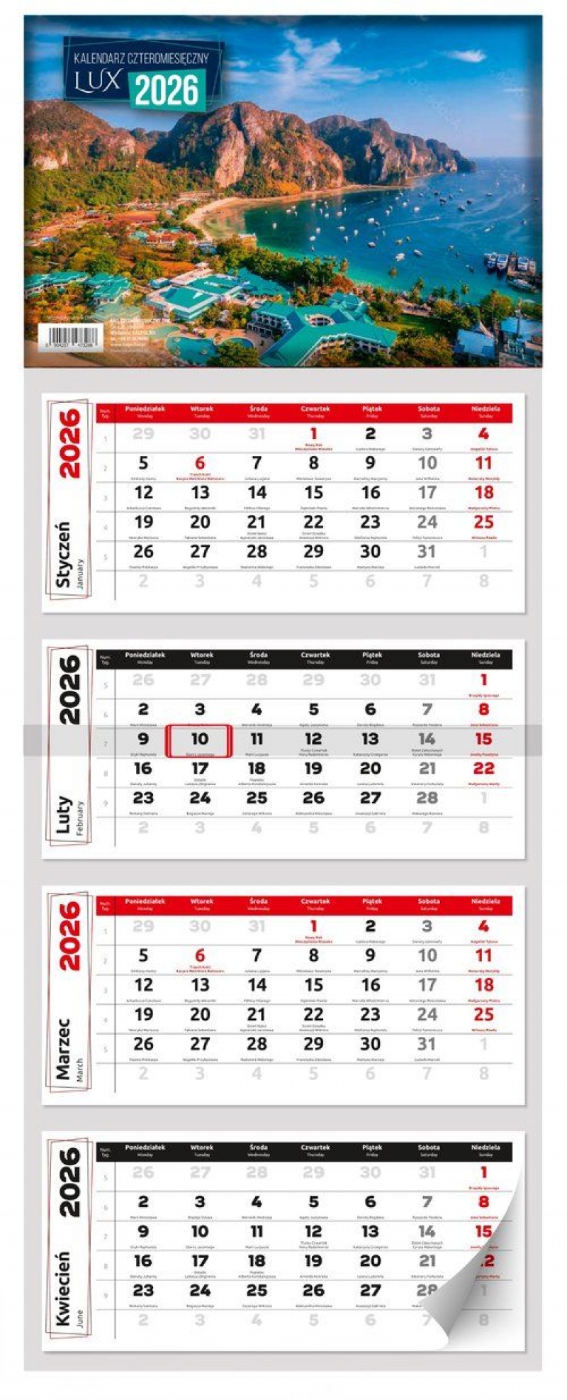 KALENDARZ CZTERODZIELNY LUX 2026 Kalendarz ścienny, czteromiesięczny z okienkiem 12 kart. Główki wypukłe 2 wzory. Wymiary po rozłożeniu...