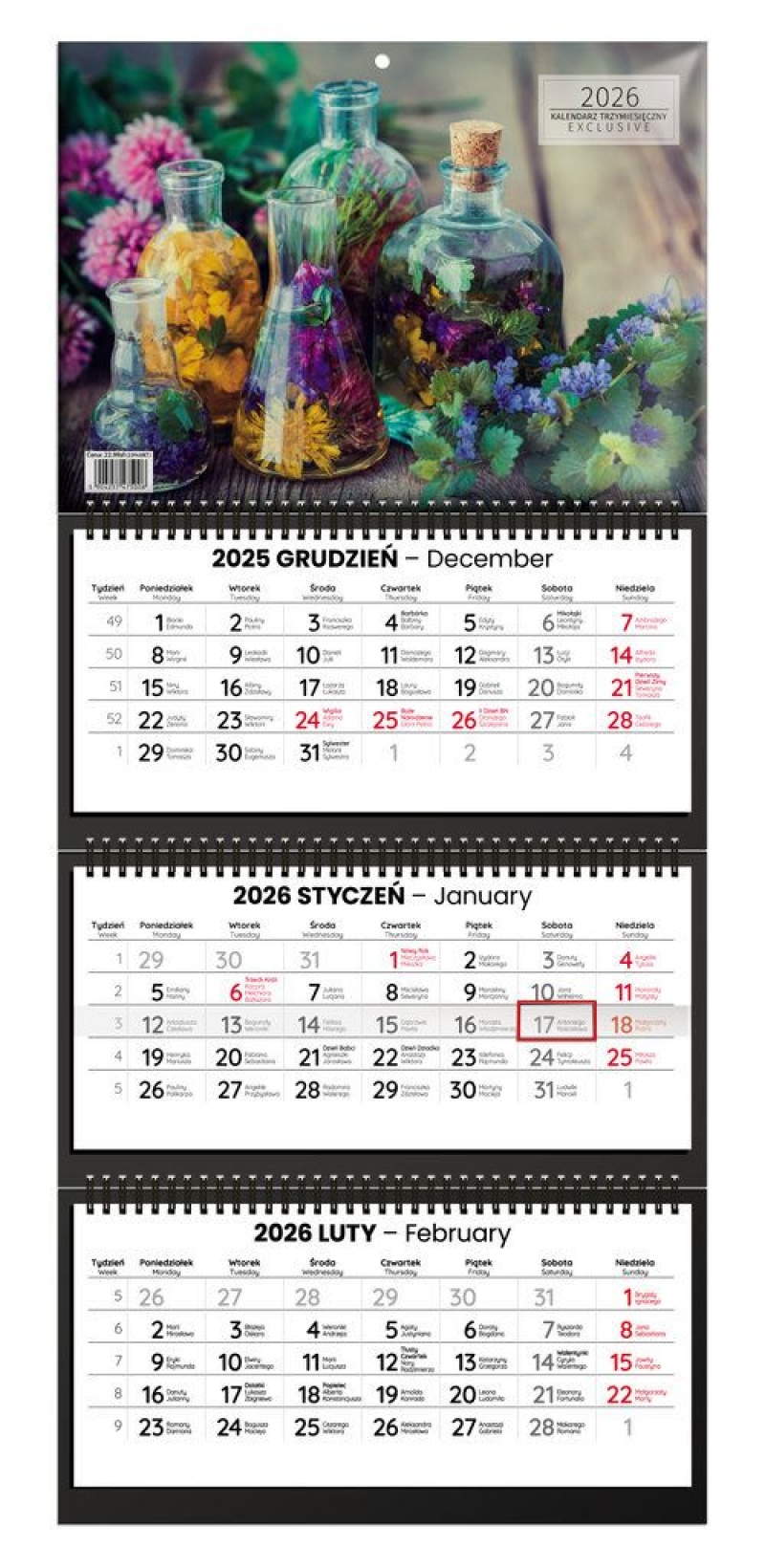 KALENDARZ TRÓJDZIELNY EXCLUSIVE 2026 Kalendarz ścienny trzymiesięczny z okienkiem; 12 kart. Główki wypukłe 2 wzory. Łączenie spirala....