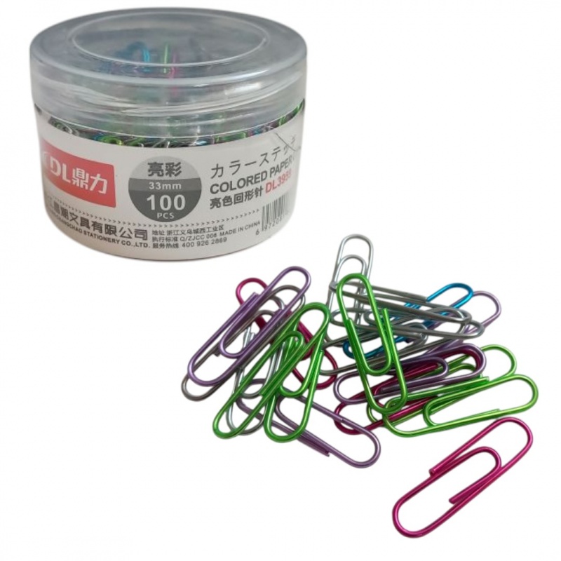 W opakowaniu znajduję się 100 sztuk metalicznych spinaczy w różnych kolorach.