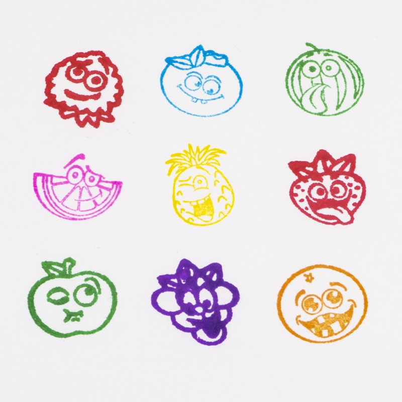 Stempelki zapachowe wzbogacone zostały w przyjemny aromat, który uatrakcyjnia produkt i sprawia, że dzieci chętniej po nie sięgają. Nowe, ciekawe wzory w szalone owoce (malina, truskawka, pomarańcza, arbuz, grejpfrut, jagoda, ananas, jabłko, winogrono) udekorują każdy rysunek małego artysty. Stempelki są samotuszujące, więc nie wymagają używania dodatkowej poduszki z tuszem.