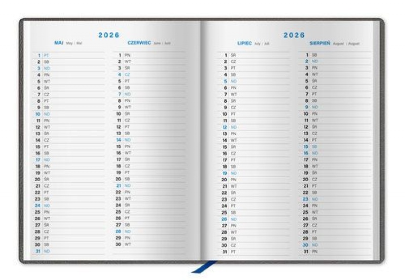 Kalendarz książkowy w twardej oprawie ze wstążką. Układ kalendarium tygodniowy. 128 stron. Wymiary 115x155 mm