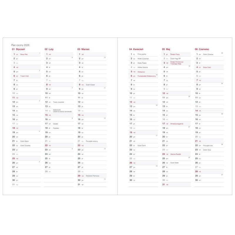 Terminarz książkowy formatu A4 (204 x 280 mm), objętość 152 strony. Język: PL/EN/DE.