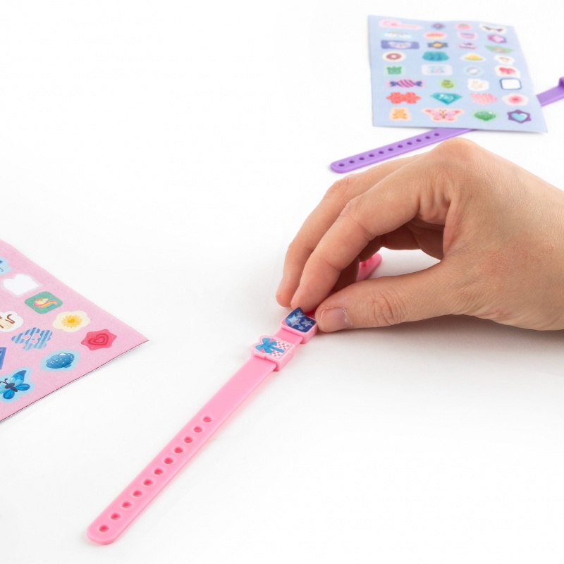 Zestaw dla małych projektantek biżuterii zawierający dwie bransoletki w odcieniach fioletu i różu oraz 32 charmsy, które można swobodnie nakładać i zdejmować. Każdy charms można dodatkowo spersonalizować dzięki dołączonym 64 naklejkom. Idealny prezent pozwalający na wyrażenie indywidualnego stylu, a stworzoną bransoletką można wymienić się z przyjaciółką.