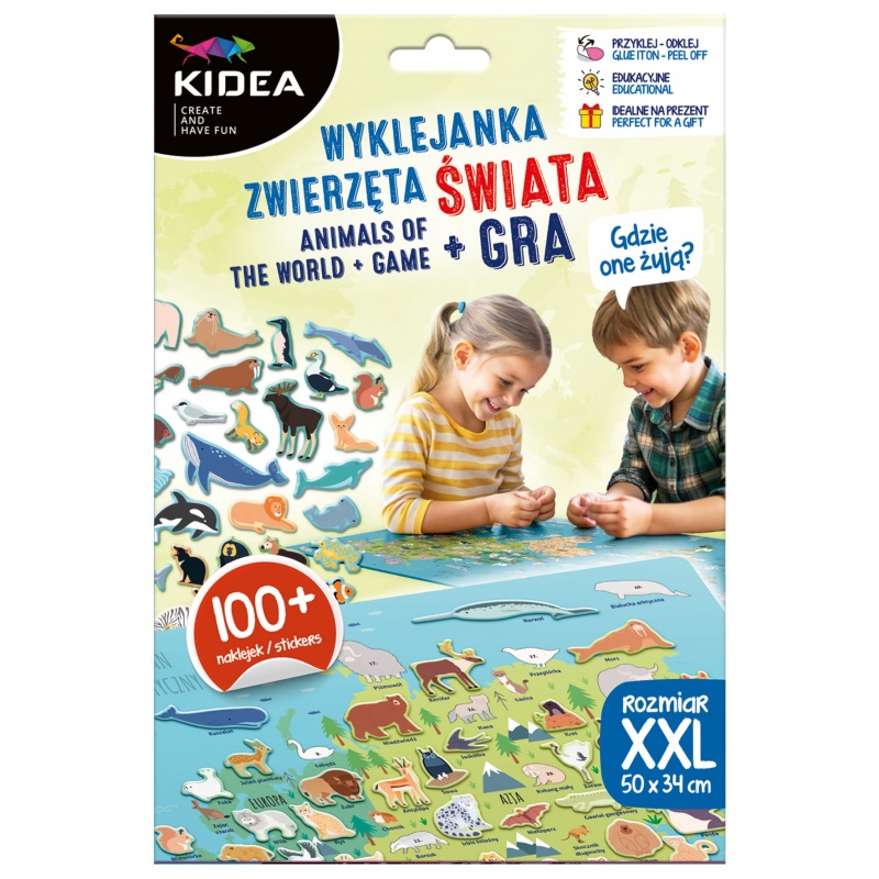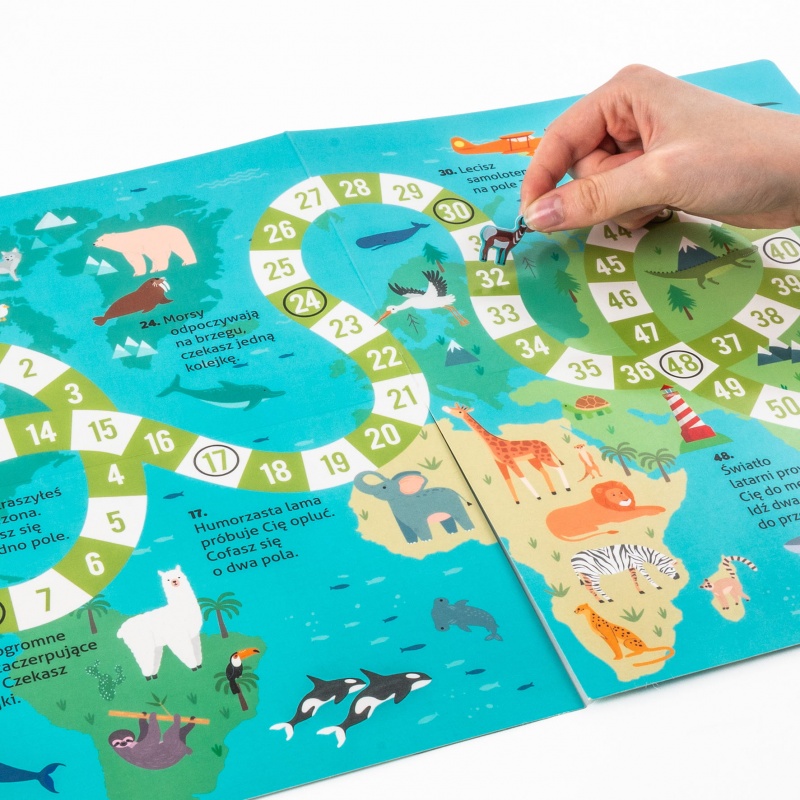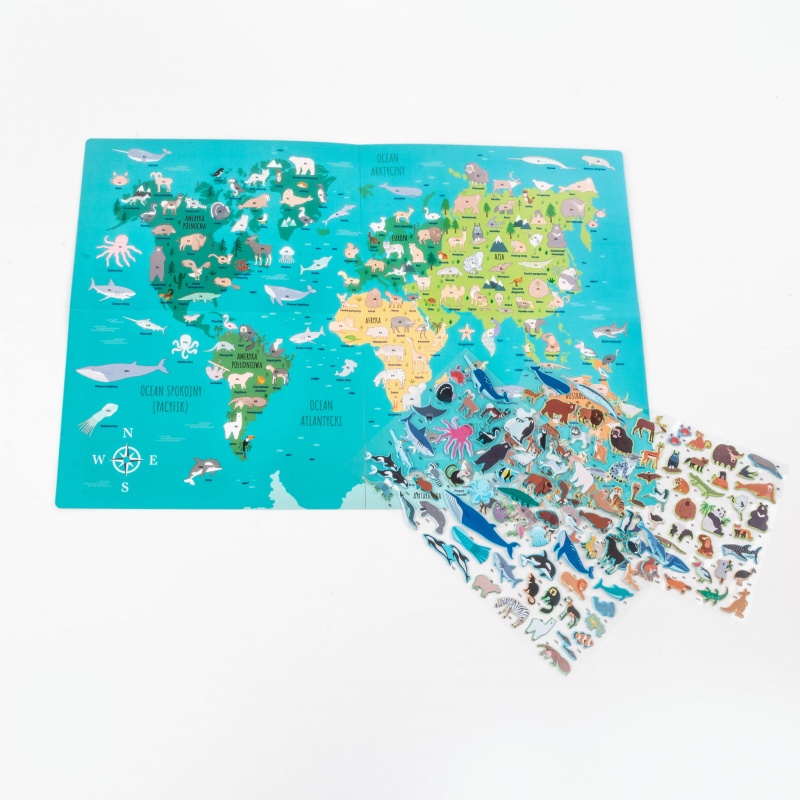 Wyrusz w ekscytującą podróż dookoła świata i odkryj fascynujące zwierzęta każdego regionu! Poznaj pingwiny w lodowej scenerii Antarktyki, lwy na afrykańskich sawannach oraz kangury skaczące po australijskich równinach. Zestaw zawiera naklejki ze zwierzętami, które można umieszczać na mapie zgodnie z oznaczeniami, aby zobrazować ich naturalne środowiska. Ta niezwykła zabawa rozwija jednocześnie wiedzę geograficzną i biologiczną. Dodatkowo, na odwrocie mapy czeka niespodzianka – wciągająca gra planszowa, która dostarczy wielu godzin rodzinnej rozrywki. To idealne połączenie nauki i zabawy: rozwija wyobraźnię, poszerza horyzonty i uczy o różnorodności świata przyrody.